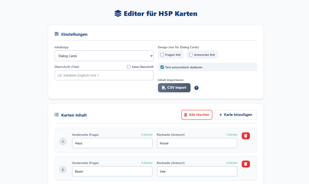 Dieser Editor macht es möglich. Du kannst den Inhalt einzeln eingeben oder per CSV hochladen. Kopiere dann den JSON-Code in den H5P Wizard (unter Schritt 5) und deine H5P-Datei wird generiert.
